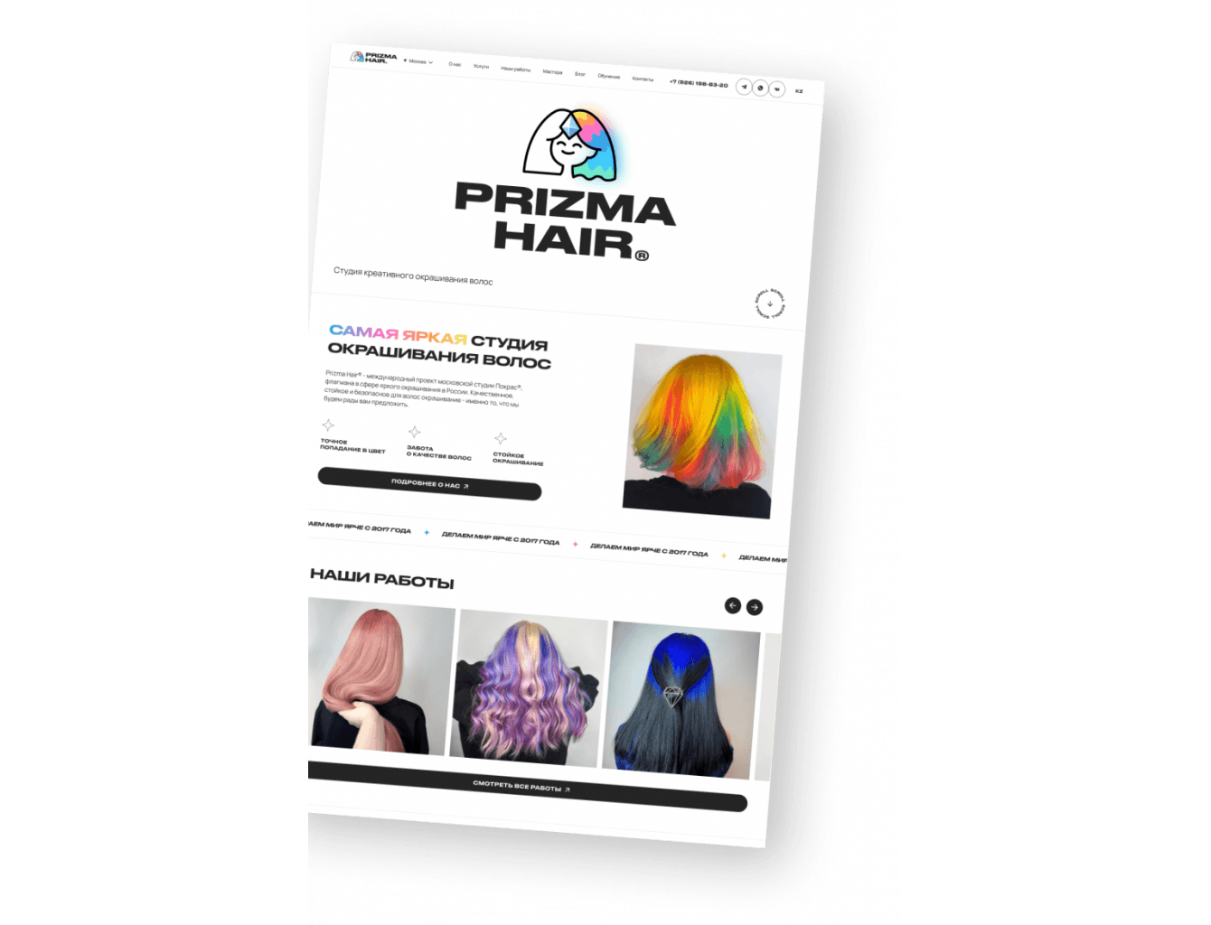 Центральное позиционирование бренда: Главная страница погружает пользователя в мир Prizma Hair, подчеркивая уникальные ценности студии и её креативный подход через яркие визуальные элементы и фотографии работ.