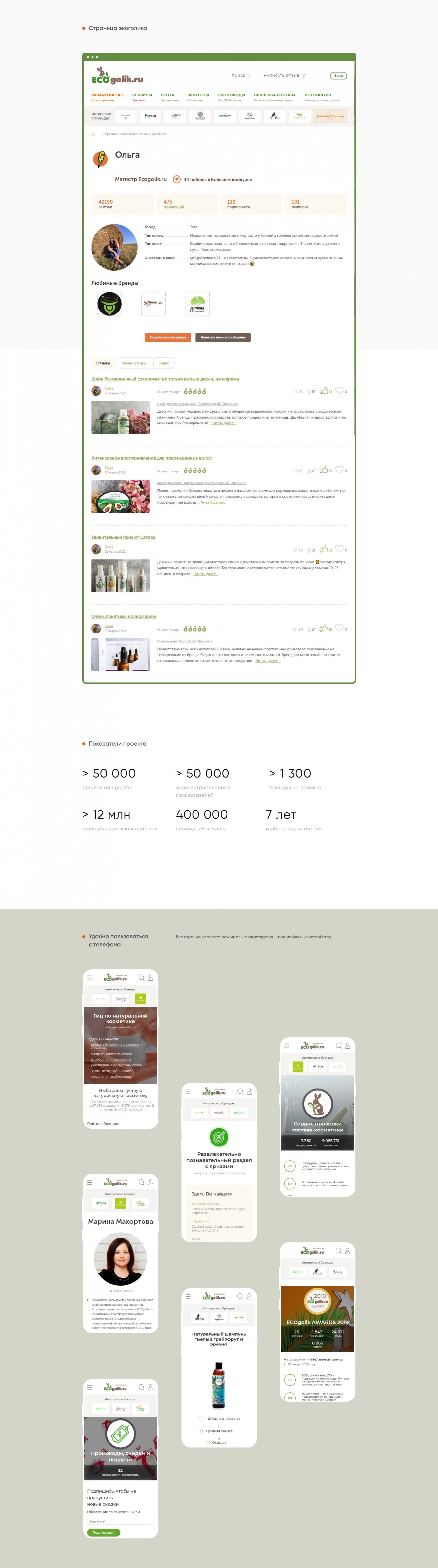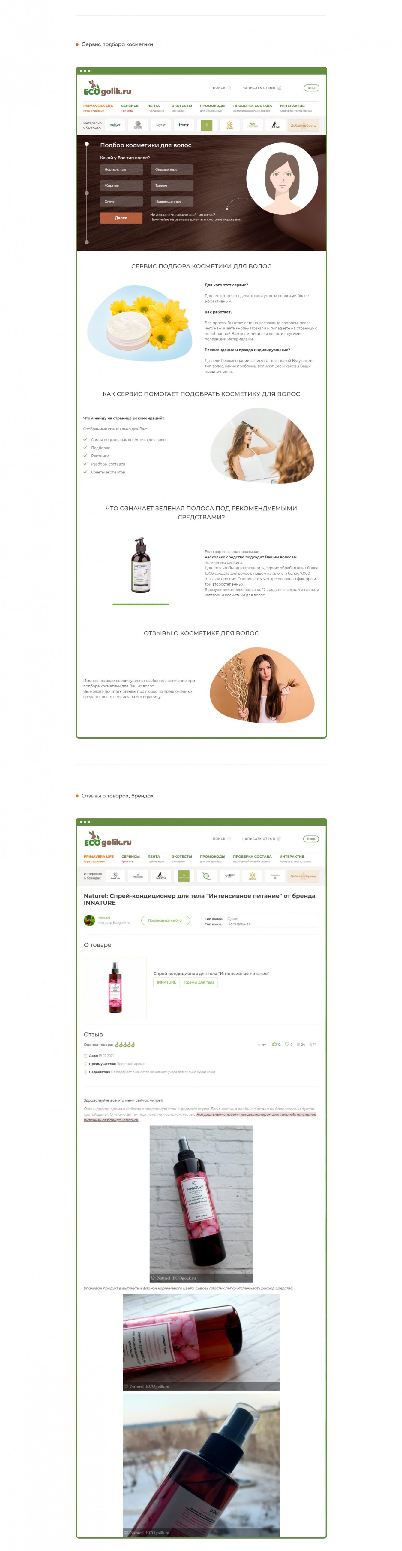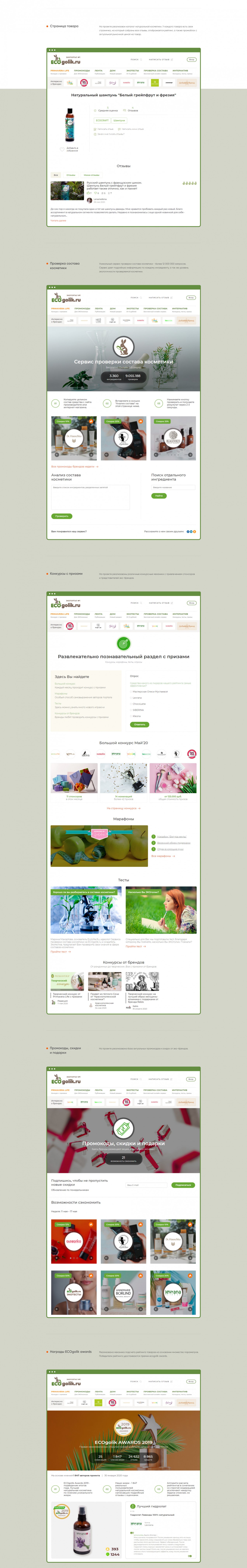 Реализована механика подсчета рейтинга товаров на основании множество параметров. Победители рейтинга удостаиваются премии ecogolik awards.