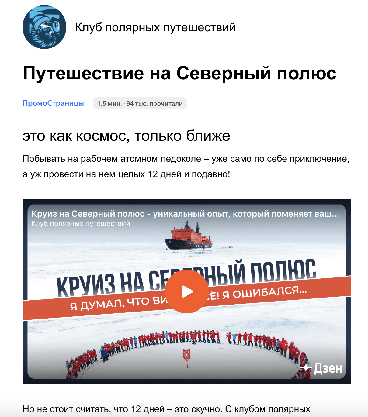 Стоимость туров начинается от 600 тыс. р., не включая авиаперелеты, медицинскую страховку и топливные сборы. В среднем время принятия решения о покупке тура в полярные регионы доходит до 1 года, поэтому мы решили протестировать этот ПромоСтраницы Яндекса, чтобы увеличить интерес пользователя к путешествию и тем самым сократить цикл принятия решения о покупке.