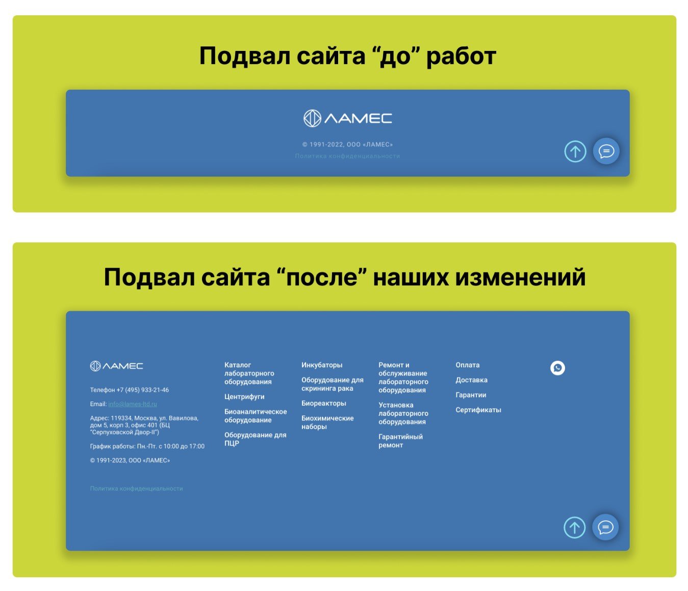 Переработали подвал сайта. Внизу страниц добавили кнопку связи через мессенджер, разместили контакты компании, показали структуру сайта и страницы о гарантийном ремонте.
