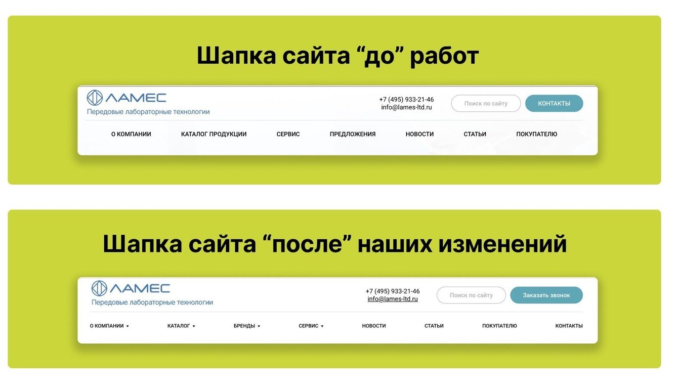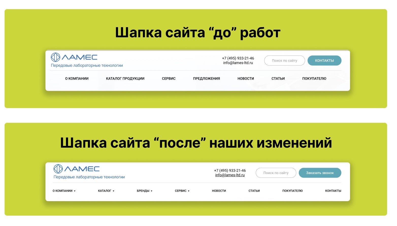 Далее приступили к проведению коммерческого аудита. Проанализировали все факторы, которые влияют на удобство покупателей на сайте, а также изучили ресурсы конкурентов, чтобы понять, каких фишек не хватает компании «Ламес». Ниже разберем основные изменения, которые внесли по итогам коммерческого аудита.