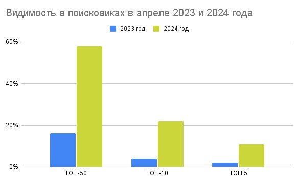 В ТОП-50 попадают 58% запросов из семантического ядра, в ТОП-10 — 22%, в ТОП-5 — 11% запросов. Это сильный рост по сравнению с началом работ. Тогда в ТОП-50 входили 16% запросов, в ТОП-10 — 4%, в ТОП-5 — всего 2% от запросов.