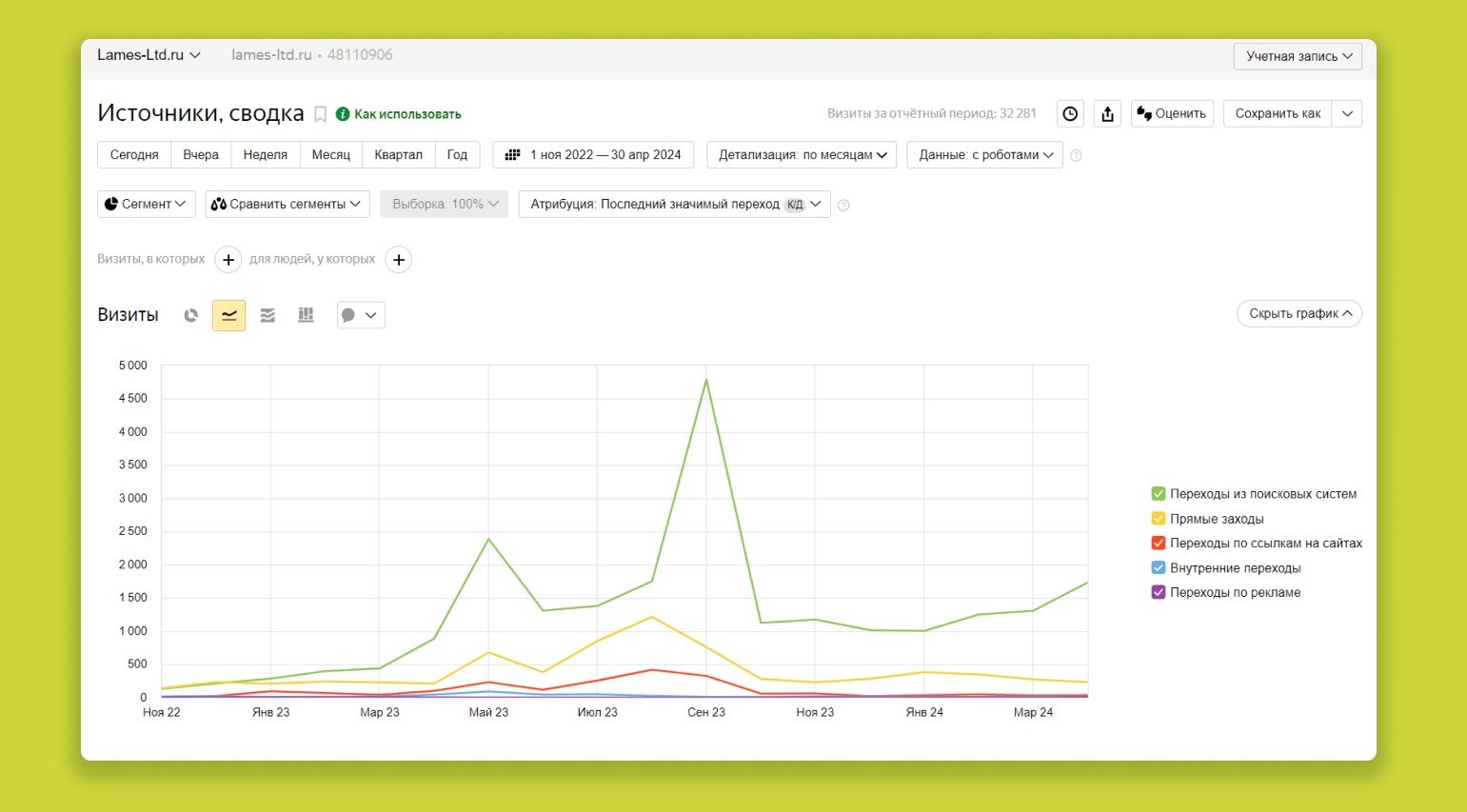 Клиент обратился в агентство SEO Интеллект в конце 2022 года с задачей: с помощью продвижения в Google и «Яндексе» увеличить продажи, звонки, заявки и все остальные метрики. На старте сайт получал около 150 визитов из поисковиков в месяц. Мы оговорили, что не сможем напрямую повлиять на заявки, но обеспечим приток нового трафика на сайт и начали работать.