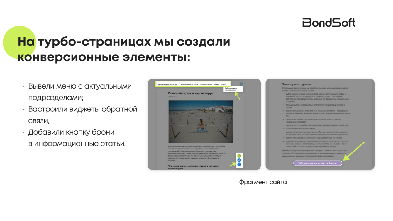 — Явный призыв к действию внутри каждой статьи — через закреплённый модуль бронирования.