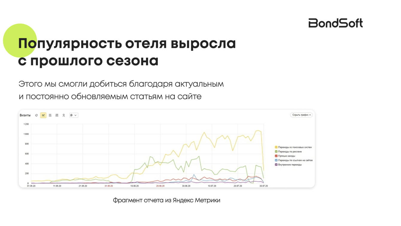 Отслеживали позиции, рост ядра, глубину просмотра, поведенческие факторы. Цель — не просто больше трафика, а целевой трафик, который остается, читает и бронирует.