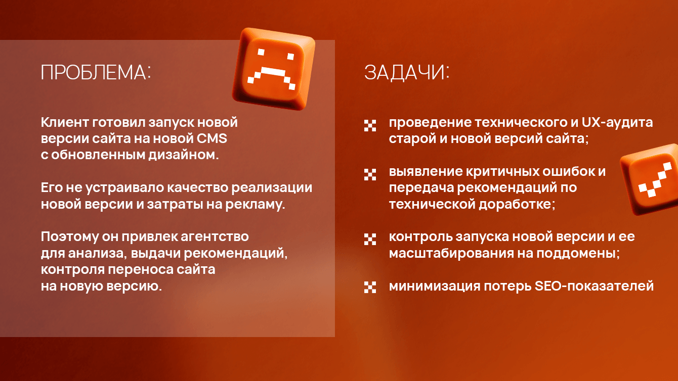 «Перед стартом проекта были очевидны стандартные риски, связанные с переносом сайта: проблемы совместимости шаблонов, сложная система управления контентом, большое число региональных поддоменов. От нас как подрядчика по SEO требовались глубокие знания и опыт в области SEO-миграций, а также современный подход к работе с многоуровневыми доменными структурами и умение восстанавливать видимость ресурса после изменений. Нам удалось минимизировать отрицательные эффекты переноса, вернуть стабильную работу сайта, обеспечить дальнейший уверенный рост позиций. Это стало возможным благодаря структурной работе, пониманию приоритетов бизнеса и эффективному взаимодействию с клиентом».