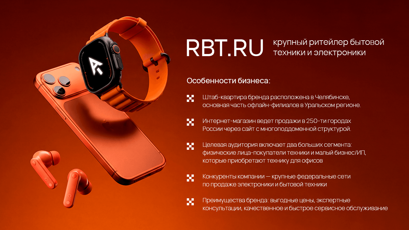 Компания RBT — крупный ритейлер бытовой техники и электроники. История бренда насчитывает почти 100 лет и начинается с ремонта и производства сложных технических устройств. В настоящее время компания ведет розничные и оптовые продажи, включает сеть розничных салонов, интернет-магазин и сертифицированный сервисный центр. В каталоге магазина более 15 000 моделей компьютерной, цифровой, бытовой техники.