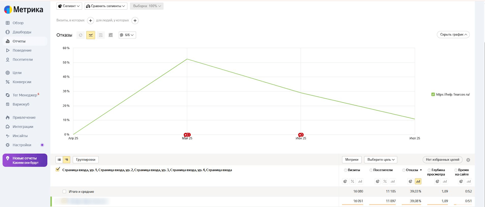 По данным Яндекс.Метрики, сократился процент отказов более чем в 4 раза и выросла глубина просмотра на 25% — пользователи стали дольше оставаться на сайте и активнее взаимодействовать с контентом.