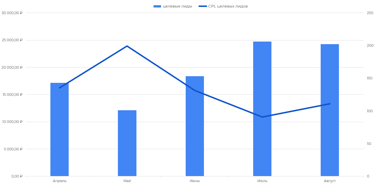 Совместно с мерами по оптимизации рекламных кампаний это решение позволило нам снизить среднюю стоимость целевого, подтвержденного клиентом, лида за месяц с 12 571,72 до 8 918,15 рублей и увеличить их количество со 145 до 211.