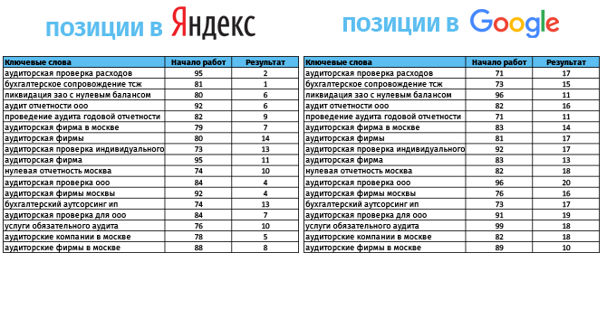 - продвижение сайта бухгалтерских услуг в ТОП-10 поисковых систем Yandex и Google