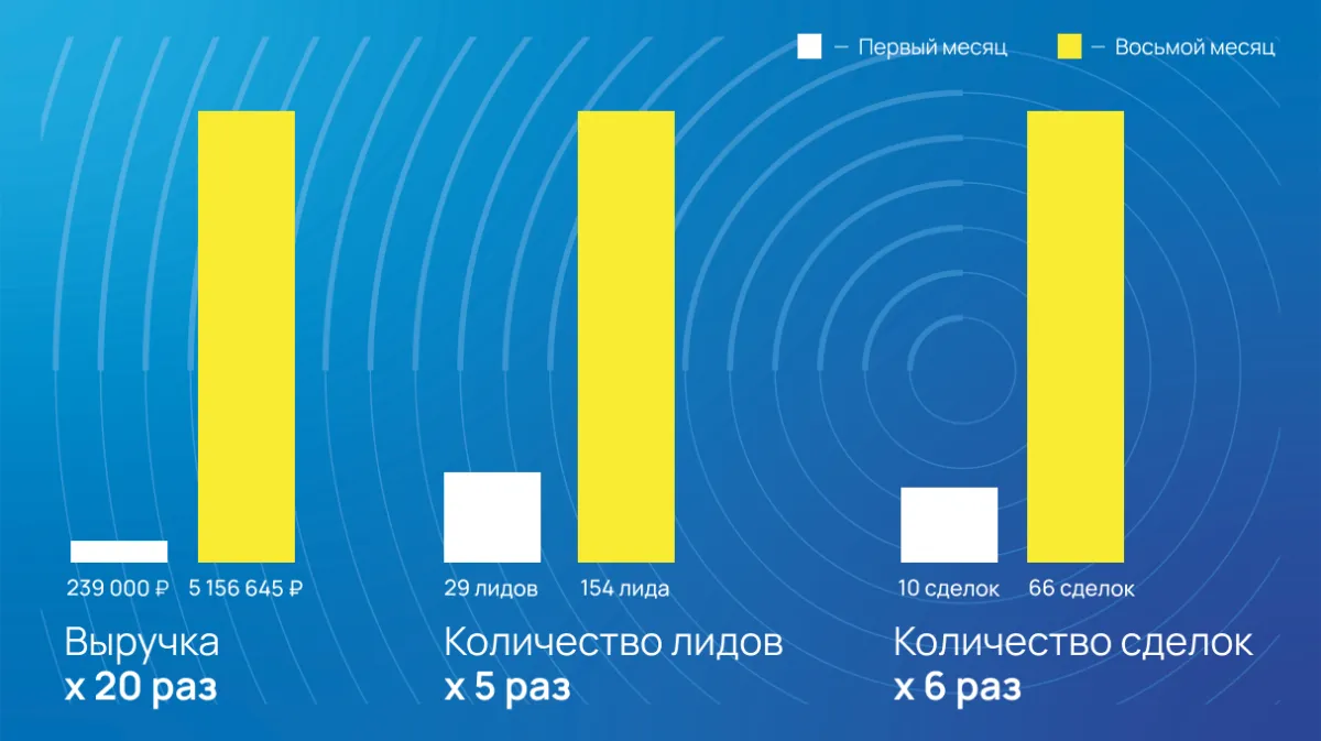 Наши действия по корректировке стратегии увеличили количество лидов в пять раз, количество сделок в шесть раз, а выручку с 230000 рублей до 5156645 рублей в месяц.