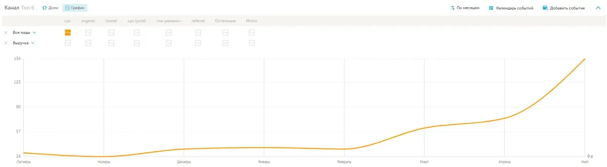 - Количество лидов: первый месяц - 29 лидов, восьмой - 154.