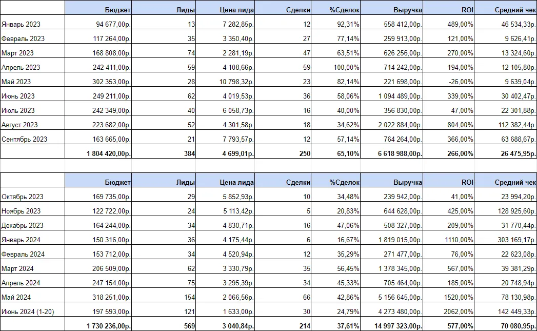 Сентябрь 2023 года, когда еще не работали с клиентом, была 21 заявка по 7 793 руб.