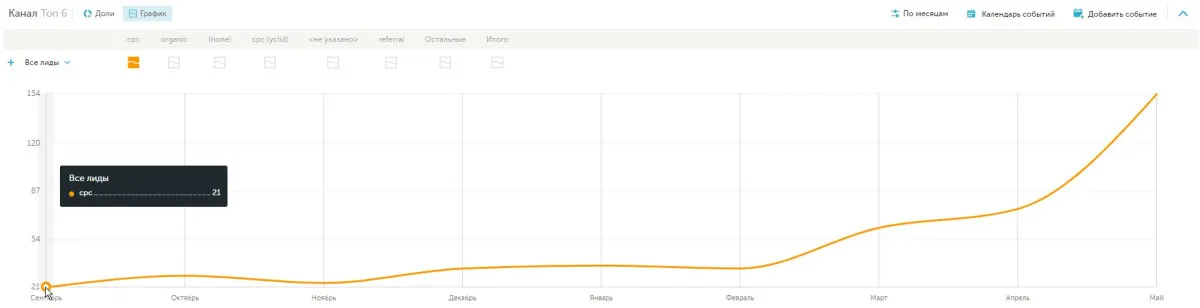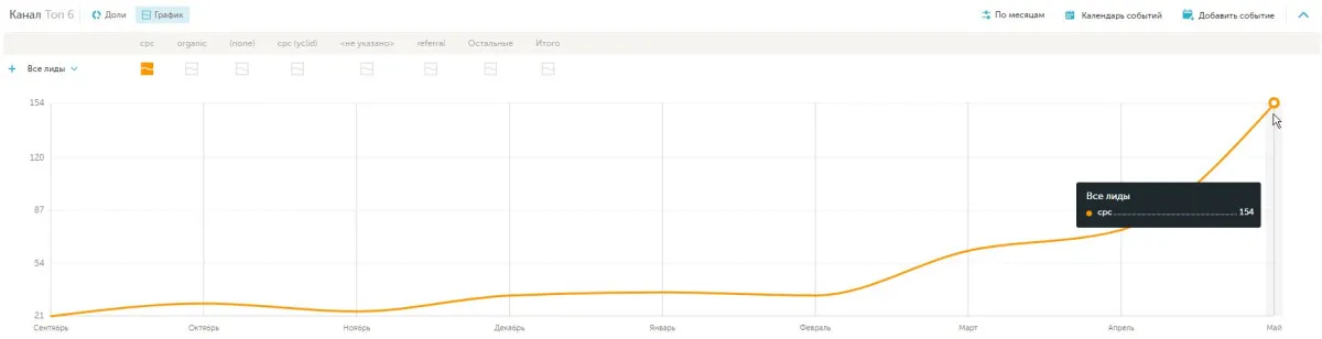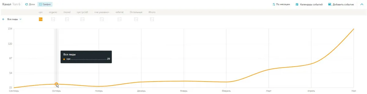 - Количество лидов: первый месяц - 29 лидов, восьмой - 154.