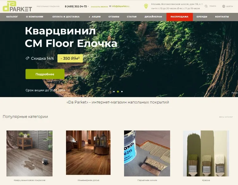 Федеральный интернет-магазин напольных покрытий ДаПаркет, в ассортименте которого более 50 брендов со всего мира. Аудитория — розничный покупатель и дизайнеры интерьера. Ценовой сегмент: средний/премиум. Склад расположен в Москве, доставка - по всей России через транспортные компании.