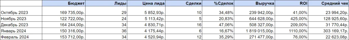 Первый месяц работы - октябрь 2023 года. Всего 29 лидов по 5 852 руб.