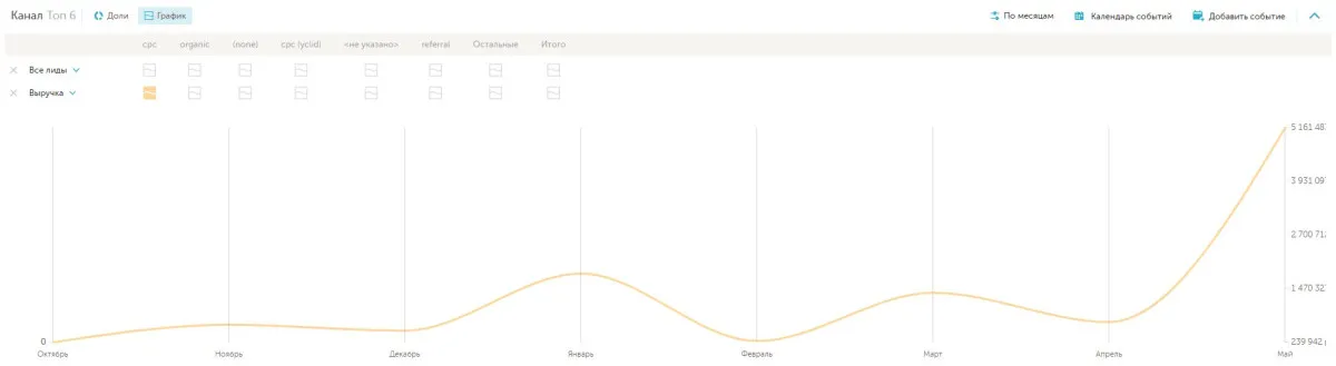 К марту количество лидов выросло почти в два раза: с 34 до 62, выручка поднялась в пять раз: с 271477 руб. до 1378345 руб