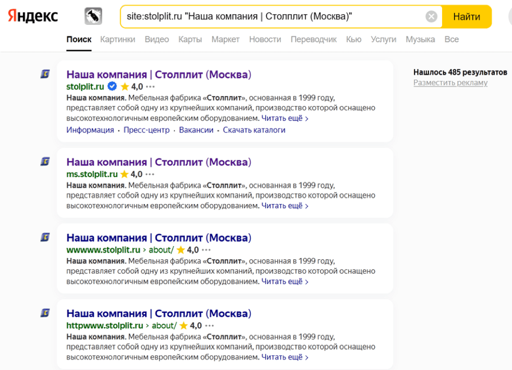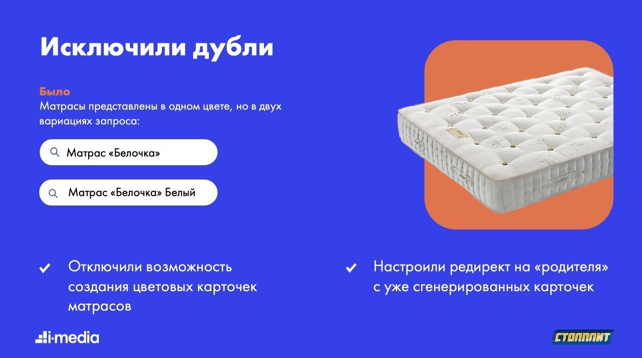 На сайте stolplit.ru в разделе «Матрасы» товар был представлен в одном цвете, но в двух вариациях запроса: Матрас «такой-то», Матрас «такой-то» Белый. Карточки белых матрасов определялись поисковыми системами как дубли. Тогда мы отключили возможность создания цветовых карточек матрасов и настроили редирект на «родителя» с уже сгенерированных карточек.