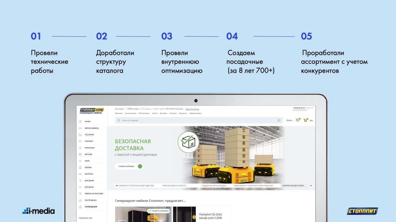 Весь 2019 год мы продвигали интернет-магазин stolplit.ru по 5 000 запросам в 40+ регионах. Следили, чтобы поисковые роботы не натыкались на технические ошибки сайта, работали над внутренней оптимизацией и создавали посадочные страницы (за время сотрудничества сделали 500+ страниц).