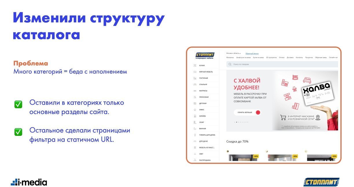 В связи с этим, мы запустили работу по изменениям структуры каталога. Оставили в категориях только основные разделы, а большую часть заменили страницами фильтра на статичном URL. Данные страницы заполнялись автоматически на основе прописанных характеристик товаров.