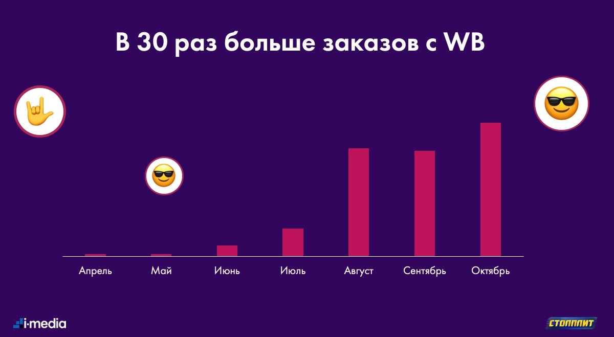 - в 30 раз больше заказов c Wildberries за 4 месяца продвижения.
