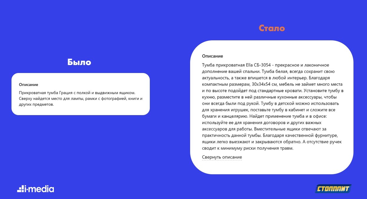 Профессиональный копирайтер готовил уникальные и читабельные описания для покупателей. Внедрили ключевые слова, которые не охватывали заголовок и характеристики. Так карточки начинали ранжироваться во множестве категорий.
