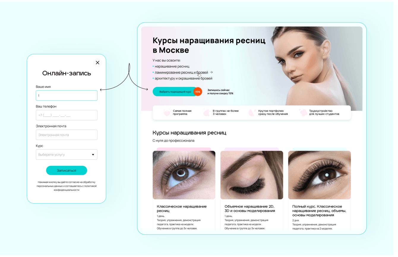После успешного сотрудничества заказчик принял решение развивать направление обучения и обратился к нам. Мы проанализовали сферу, подготовили визуал и маркетинговую стратегию и помогли запустить курсы бровистов и коррекции ресниц. Создали дополнительные страницы на сайте и новые печатные материалы. Для запуска направления с нуля понадобилось около 3 недель.