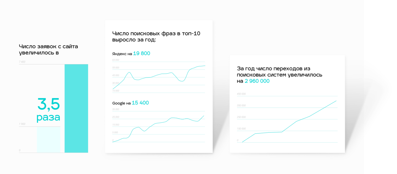 Мы добились качественного и количественного улучшения всех ключевых показателей эффективности сайта. Увеличили количество визитов и вовлеченность пользователя. За счет этого получилось повысить поведенческий фактор, что отразилось на росте позиций сайта в необходимых клиенту запросах в поисковике.