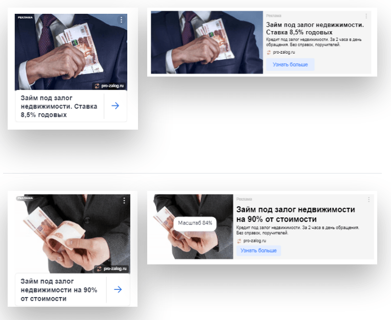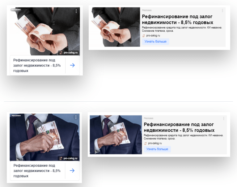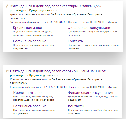 Добавлены: уточнения, быстрые ссылки, описания БС, визитка, отображаемая ссылка. Объявления разделены на 2 категории устройств десктопные и мобильные. Для А/Б теста были добавлены 2 варианта изображения.