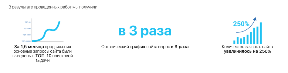 - Продвижение ключевых направлений студии в ТОП-10 поисковой выдачи