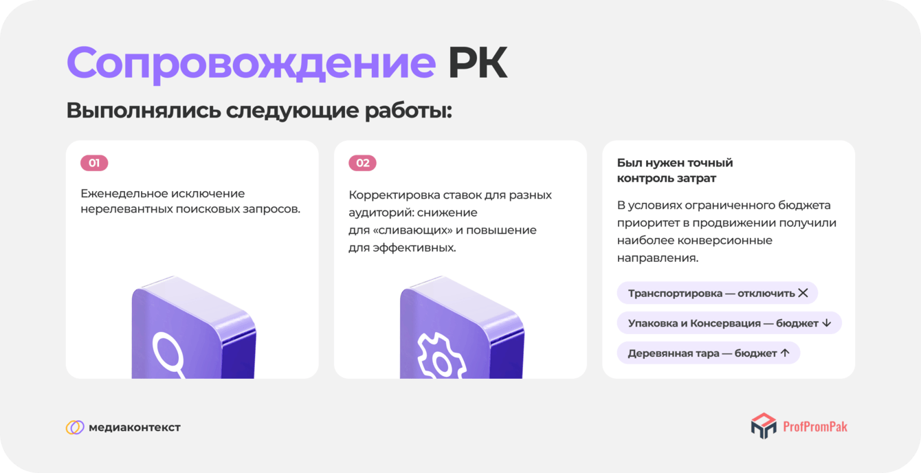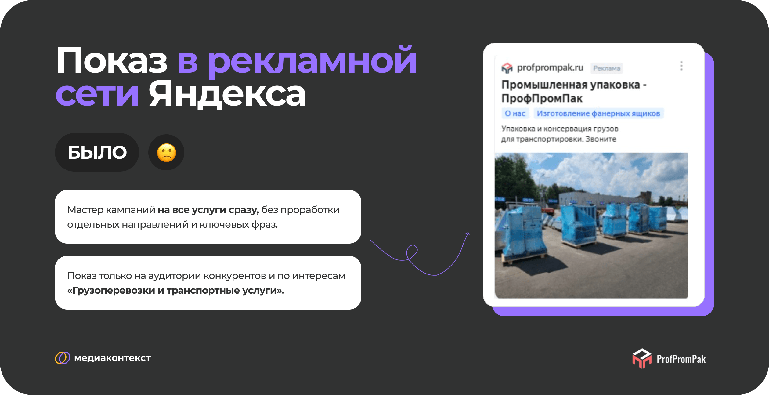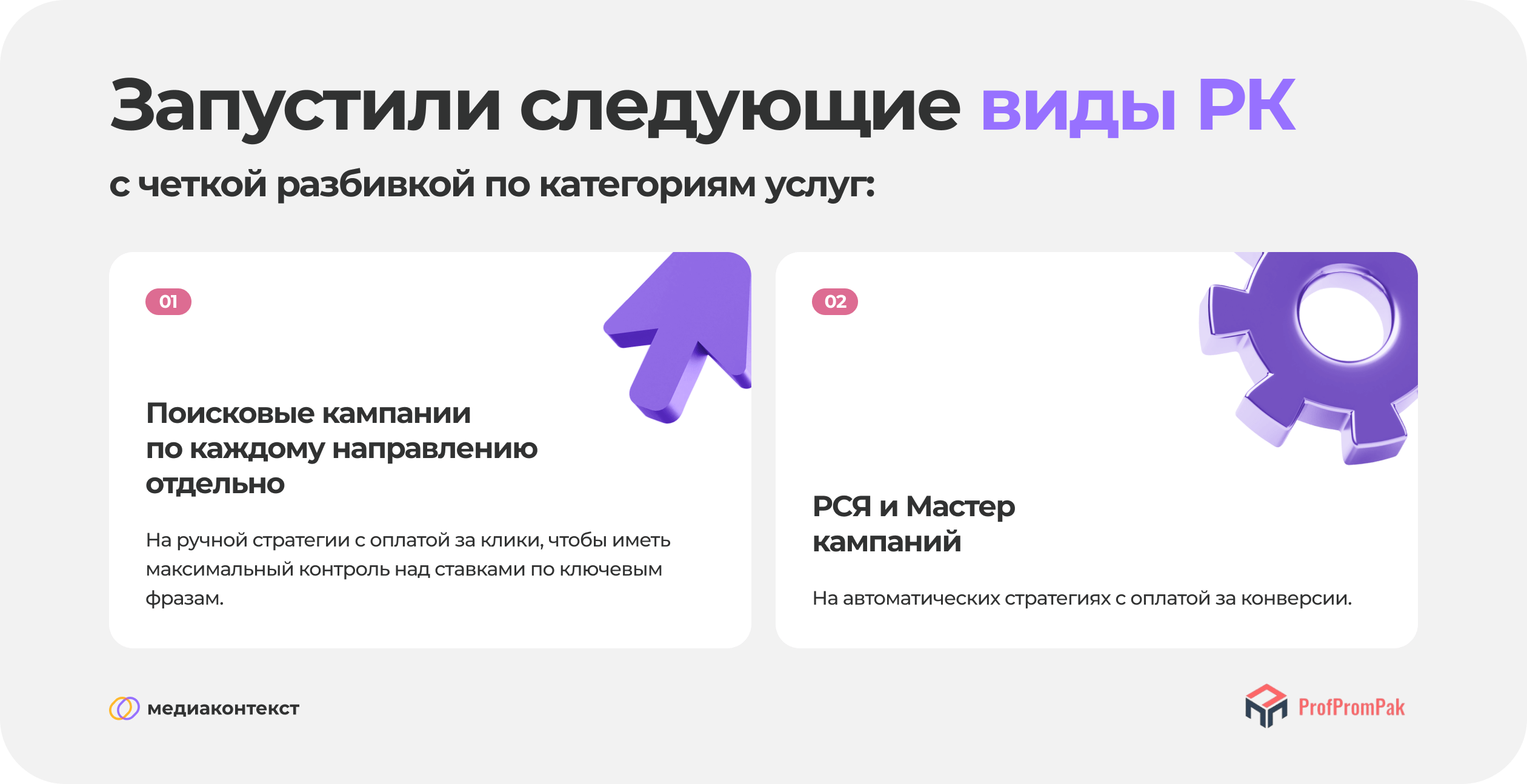 – Собрали семантическое ядро, проработали группировку, а также полный набор минус-фраз, чтобы отсечь нерелевантные запросы. На основе данных прошлых кампаний было решено брать только целевые маски по промышленной упаковке в точном соответствии: [упаковка станка], [упаковка оборудования] и тд., чтобы отсечь нецелевое: «станки для упаковки», «упаковка товара для маркетплейсов» и т.д.