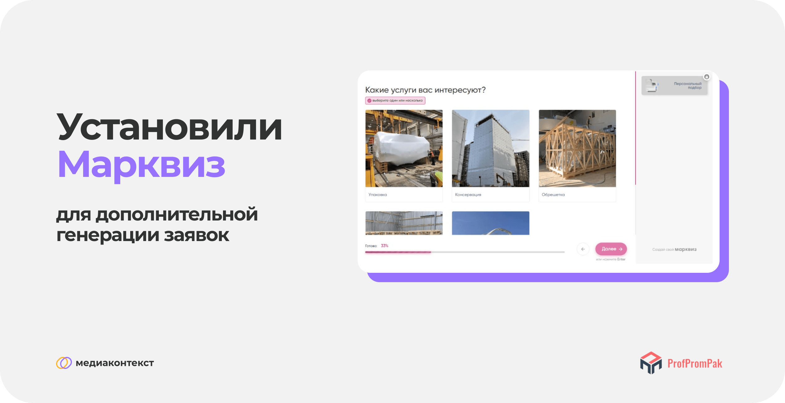 Поскольку сам сайт нуждался в крупных доработках, а форма заявки была неудобной, установили Марквиз для дополнительной генерации заявок. Этот шаг позволил нивелировать некоторые проблемы сайта для быстрого запуска рекламы.