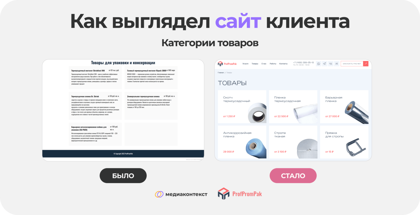Полностью пересмотрели архитектуру: разделили товары и услуги, добавили примерные цены и разместили исчерпывающую контактную информацию. Это снизило барьеры для принятия решения: клиент сразу видит, что ему предлагают, сколько это примерно стоит и где находится компания.