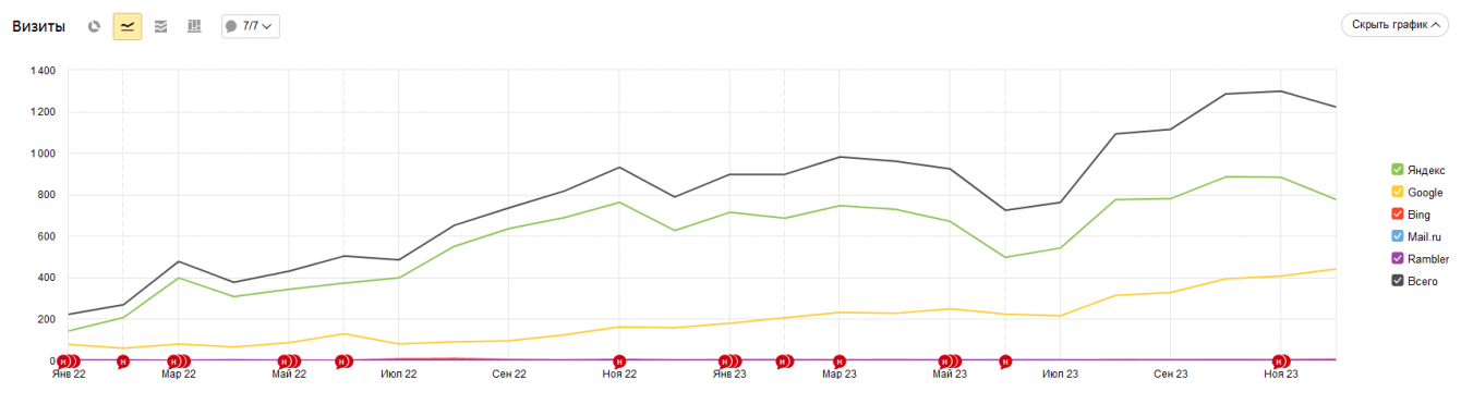 Благодаря выводу запросов в топ-10 увеличилась видимость ресурса, а трафик из поисковых систем планомерно начал расти. В январе 2022 года на сайт было совершено 222 перехода, в декабре 2023 года — 1 222 перехода, что на 1 000 больше, чем на момент старта работ по проекту.