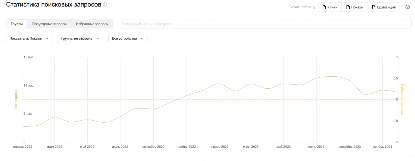 Сейчас отслеживаемых коммерческих запросов более 200, плюс увеличена общая запросная часть проекта, что наглядно видно по данным «Вебмастера». Динамика поисковых запросов увеличена по показам с 2 731 на январь 2022 года до 10 000, то есть показатель вырос в 4 раза.