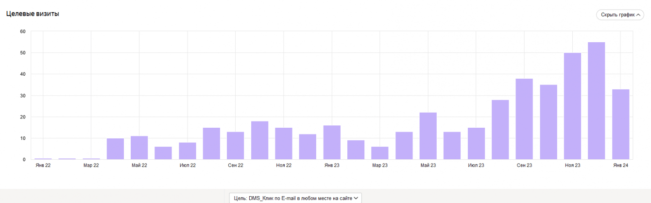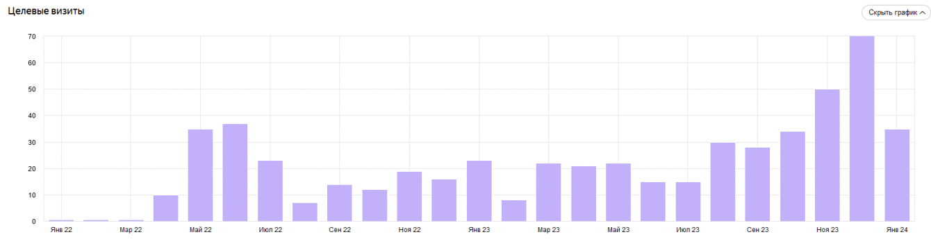 На графике ниже видно, как растет количество посетителей, которые добавляют товар в корзину и переходят в нее. На момент старта цель не выполнялась, так как каталога и функционала интернет-магазина не существовало, но после их создания постепенно увеличивалось и число целевых посещений. За последние месяцы рост особенно заметен (за январь данные взяты до 20.01.2024, то есть показан не весь месяц).