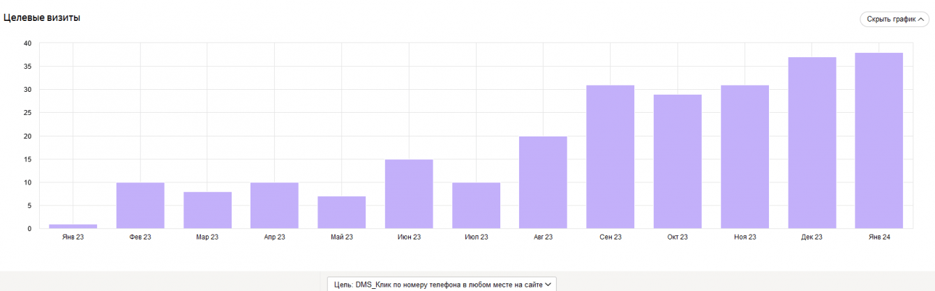 По показателям цели видно, что звонить для уточнения вопросов с номеров на сайте стали больше, чем на момент старта работ. С одной стороны, это говорит об увеличении заинтересованности, с другой — показывает точки для дальнейшего роста. Мы уточняем и фиксируем моменты, по которым чаще всего обращаются, чтобы разместить на сайте недостающую информацию.