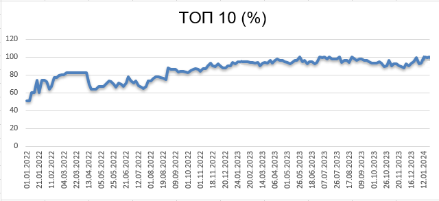 На старте в топ-10 было 34 % запросов, к концу 2022 года — 80 %, в январе 2024 года — уже 100 % текущего семантического ядра.