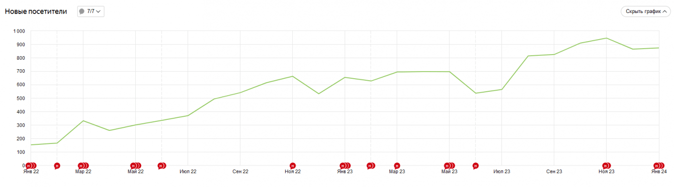 С ростом трафика и позиций в поиске все больше новых посетителей приходят на сайт. На момент начала продвижения было только 150 новых пользователей в месяц, а к декабрю 2023 года — уже около 900. Такой рост говорит, что сайт становится все более популярным и приводит новых посетителей, которые совершают действия.