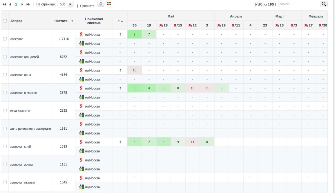 Уже в Апреле мы начали заходить на первую страницу по запросу «Лазертаг в Москве», а в Мае сайт начал ранжироваться на 2м месте по самому главному запросу - «Лазертаг». трафик начал расти и начали приходить заявки на рекламу