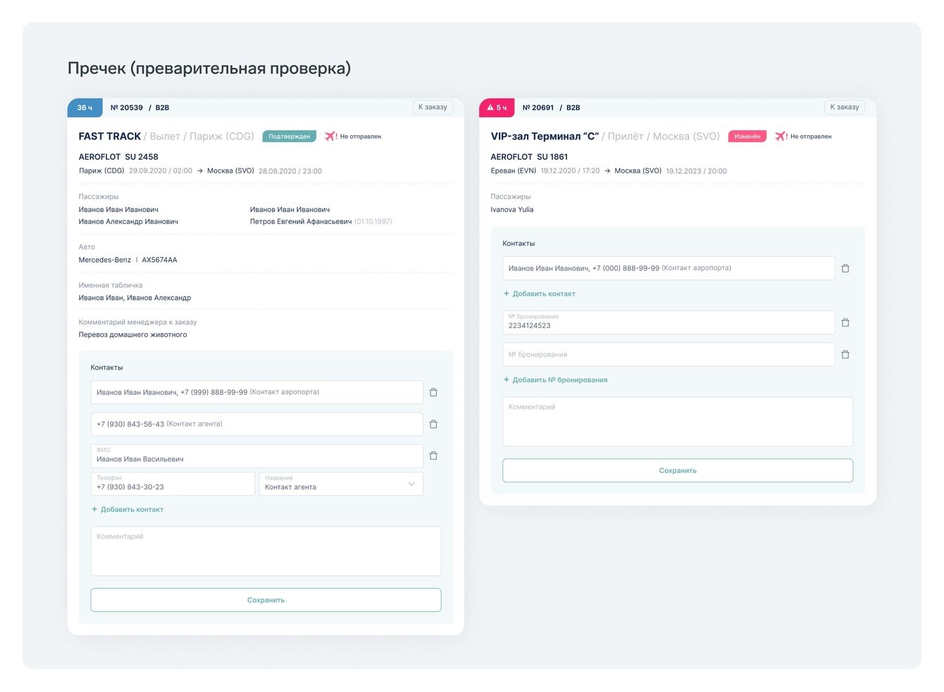 Специфика оформления заказов в аэропортах предполагает, что некоторые данные становятся известными только незадолго до предоставления услуги (например контакты сотрудника, который встречает пассажиров). В одних аэропортах эти данные предоставляются автоматически, а в других — по запросу. Но во всех случаях менеджеру на стороне сервиса нужно обеспечить их уточнение и — в ряде случаев — предоставить их клиенту.