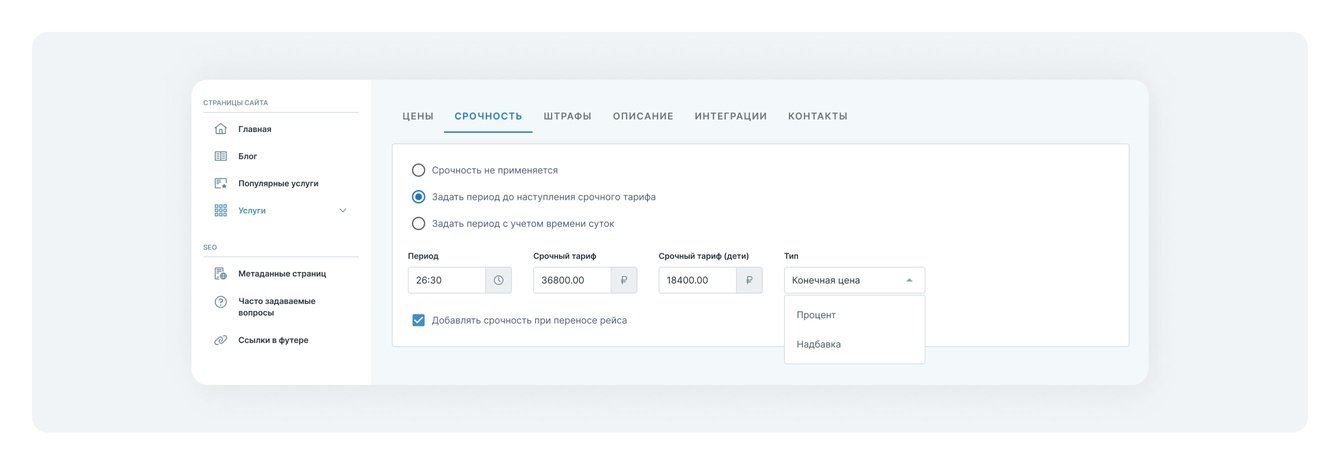 Время до наступления срочного тарифа также настраивается индивидуально — используется базовое значение поставщика (аэропорта), к которому добавляется указанное для конкретного клиента (или группы клиентов) количество часов.
