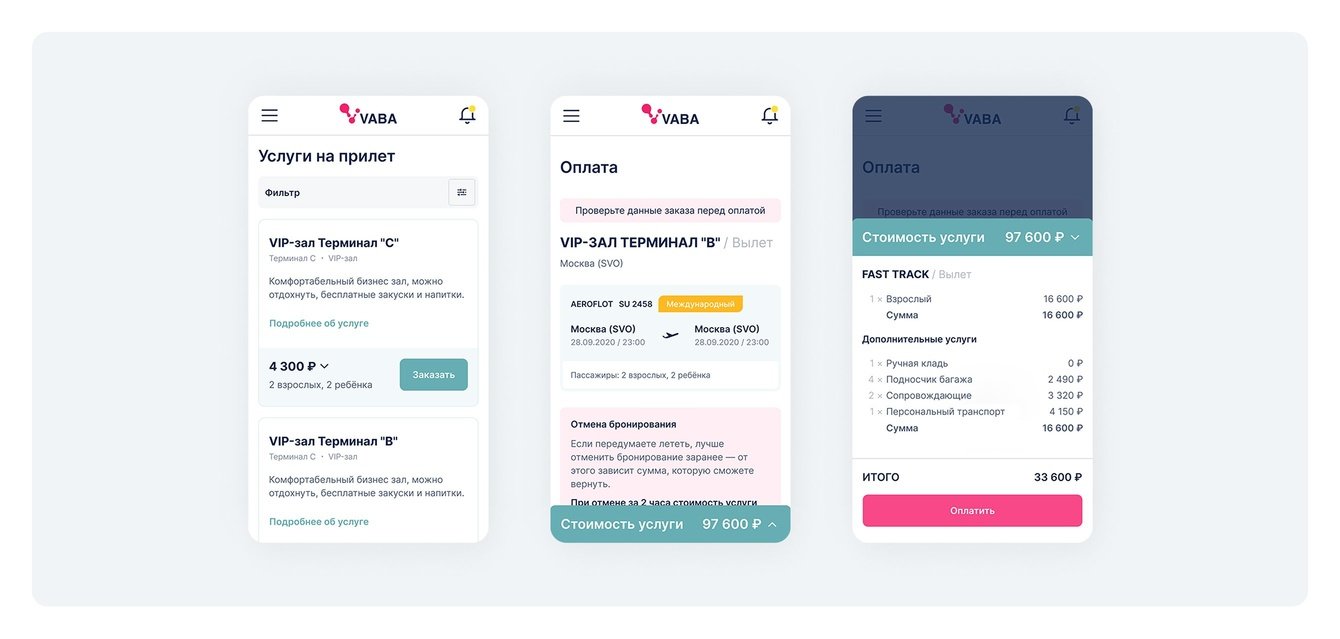 Для оформления пропуска нужно меньше данных, поэтому пользовательский интерфейс покупки этой услуги максимально упрощён. Прямая интеграция с поставщиками позволяет практически мгновенно подтверждать заказ пропуска и отправлять клиенту данные для доступа в бизнес-зал.