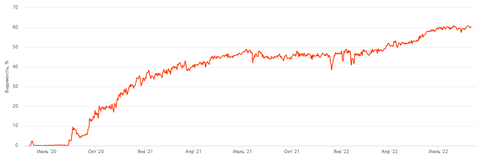 За 2 года 60% видимость, 5000 трафика, ~5 регистраций в месяц, высокая узнаваемость сайта.