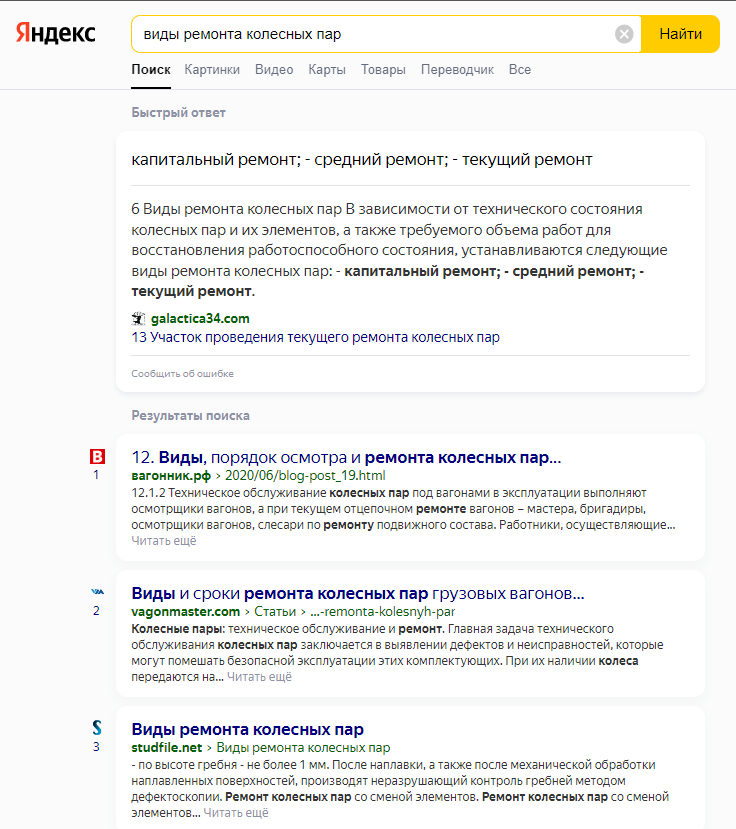 В сравнении с конкурентами мы действительно находимся выше: Вагонмастер есть в блоке быстрых ответов на позиции 0, также есть позиция в Топ-1 и в блоке похожих запросов. То есть у нашего сервиса подбора ремонта сразу три ссылки в выдаче, при обычной одной по таким запросам.
