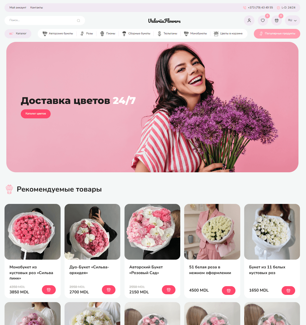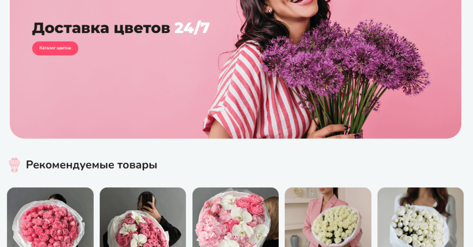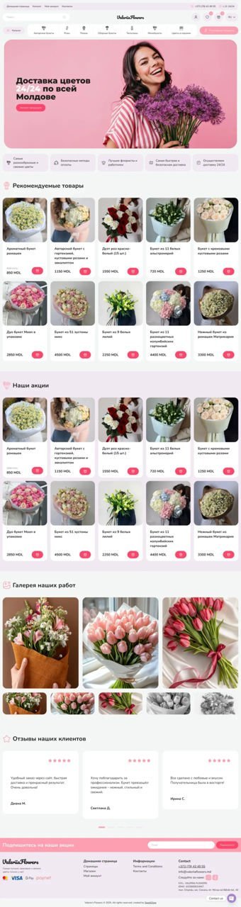 Этот проект был реализован для бренда Valeriia Flowers — современной цветочной студии, которая делает акцент на эмоции, эстетику и сервис. Основная задача — создать визуально привлекательный сайт, где заказ букета превращается в простой и приятный опыт.