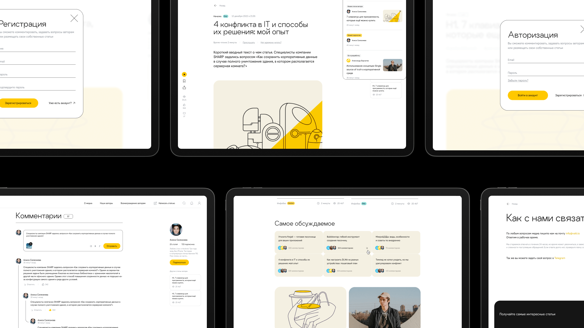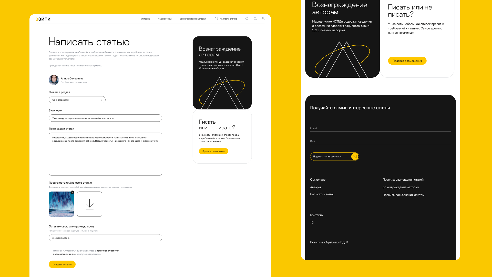 На этапе прототипирования и дизайна мы уделили внимание удобству для авторов — подробно рассказали про требования к материалам, процесс их модерации и получения гонорара, сделали личный кабинет с возможностью регистрации через сторонние сервисы и удобный интерфейс, через который автор может предложить статью.
