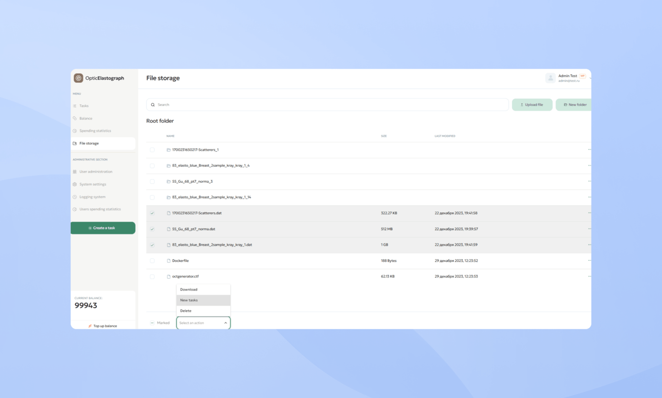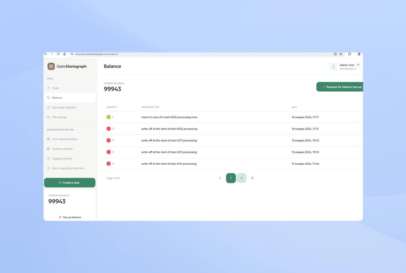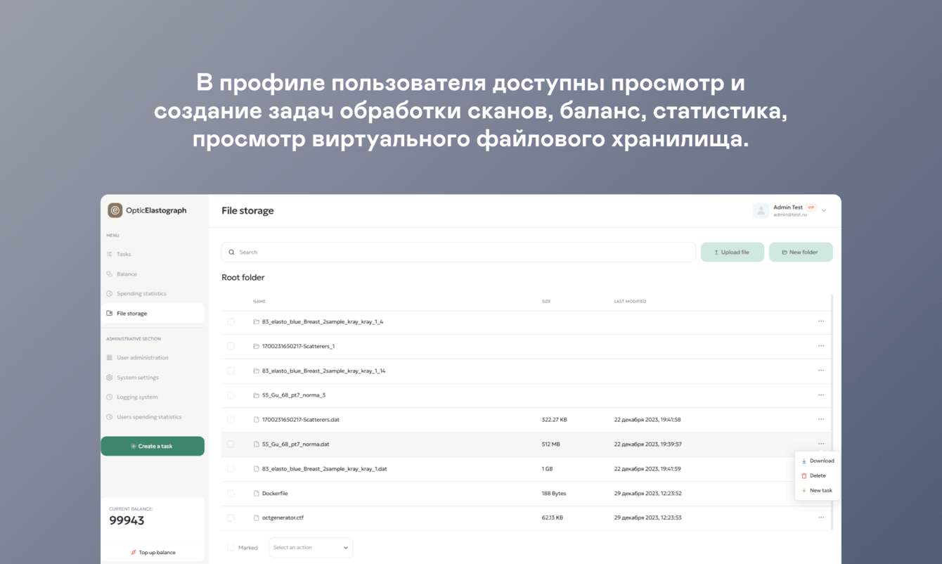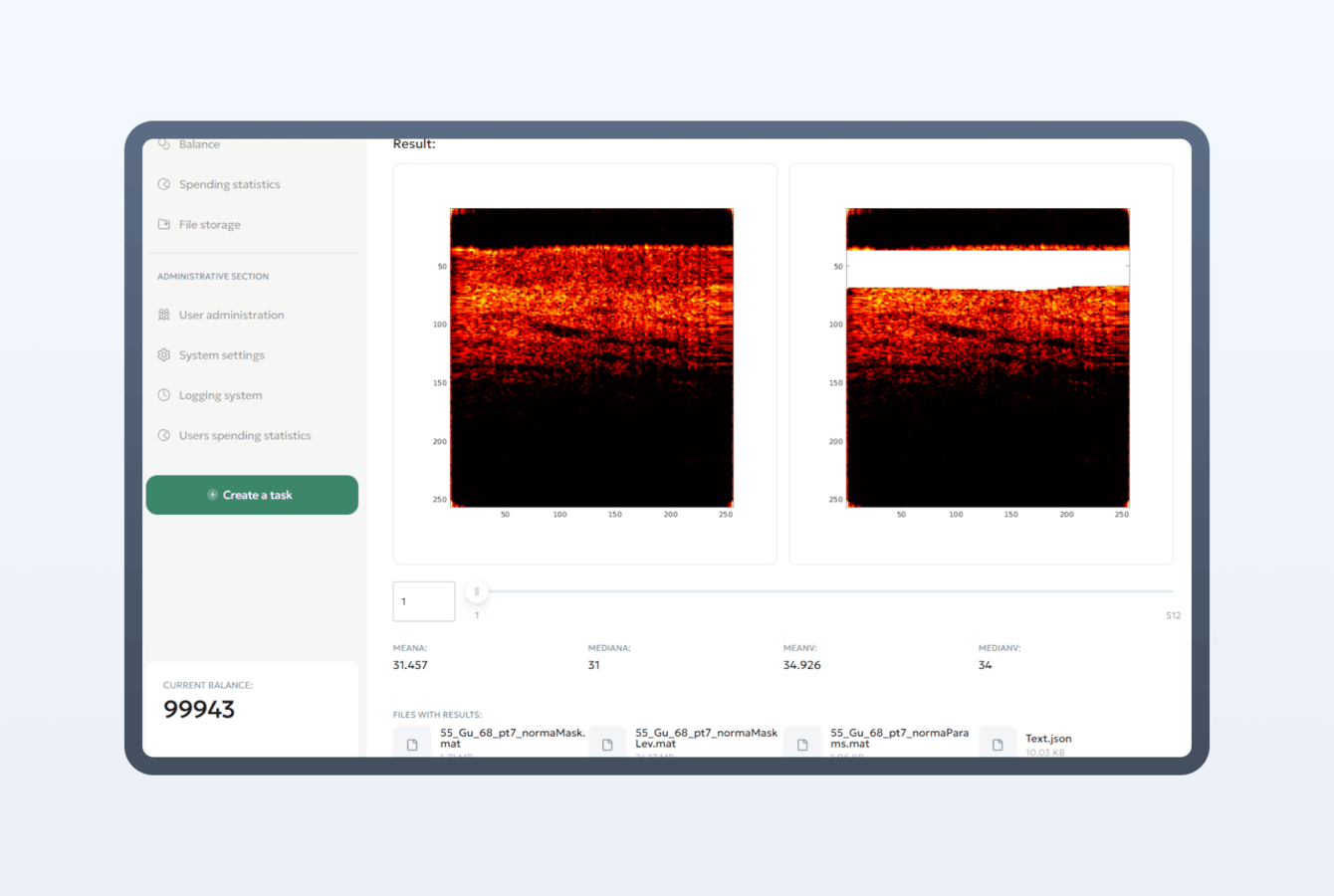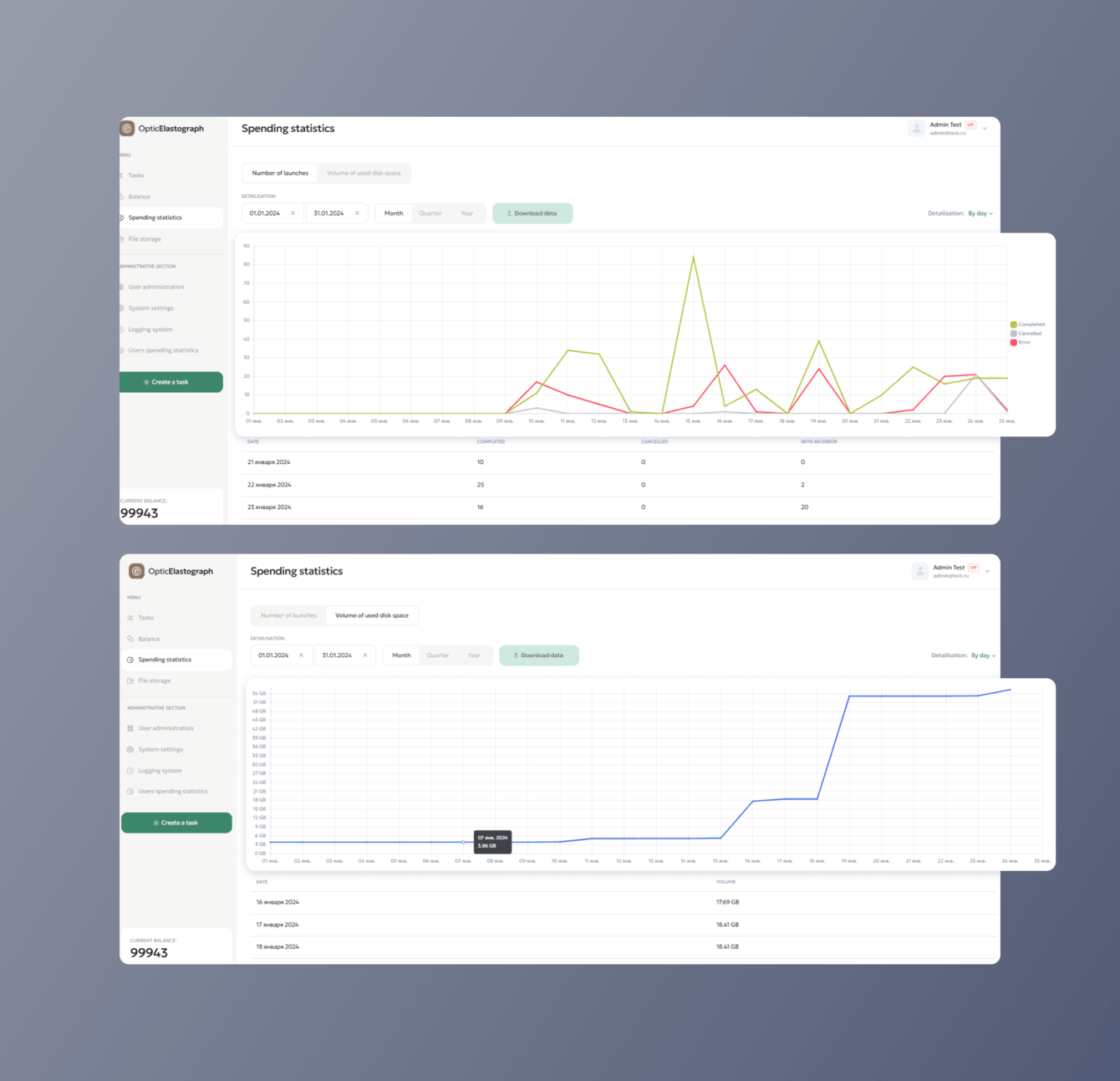Пользователю и администратору доступна подробная статистика по выполненным задачам и расходам. Исследовательский центр, клиника или другая организация могут формировать отчеты по затратам и проведенным обработкам сканов, следить за объемом файлового хранилища, куда они загружают сканы.