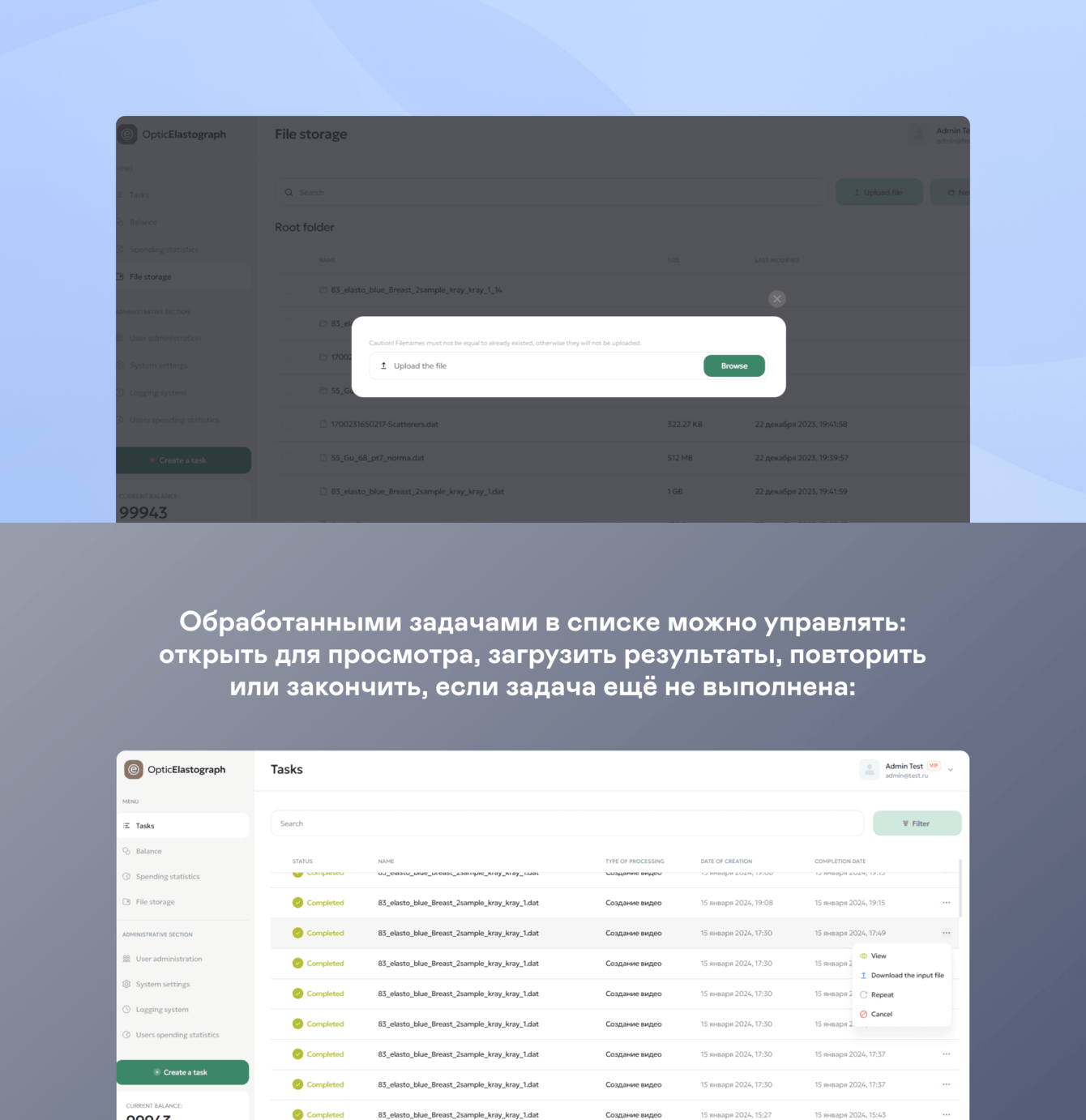 Платформа работает с томограммами обычного оптического когерентного томографа (ОКТ), и записями оптического когерентного эластографа (ОКЭ).
