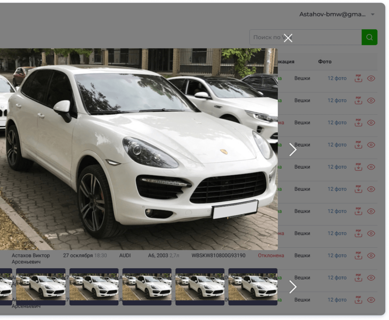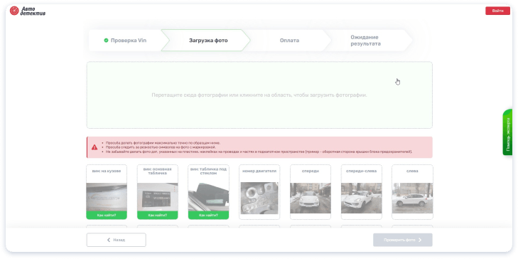 ﹥ Создание заявки. Любой пользователь может ввести основные данные интересующего его автомобиля, загрузить фото следуя примерам и подсказкам экспертов, оплатить услугу и ожидать получение отчета.